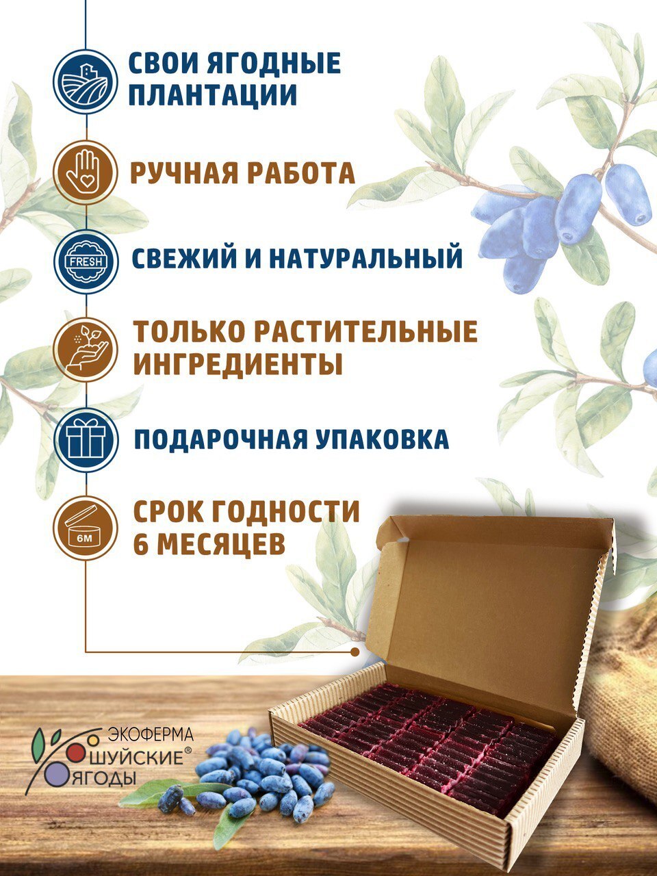 Натуральный ягодный мармелад от Шуйских ягод производится на основе 100% сока жимолости, без использования пищевых добавок, ароматизаторов и красителей. За счет сбалансированного вкуса и натурального состава содержание сахара в нем ниже, чем в обычном мармеладе. В качестве загустителя используется агар-агар, это растительный заменитель желатина, поэтому наш мармелад по праву считается постным продуктом и вегетарианским. Жимолость очень полезна и является мощным антиоксидантом. Не зря ее называют ягодой молодости, ведь она защищает клетки организма от старения и снижает риск сердечно-сосудистых заболеваний, укрепляет иммунитет, содержит витамина С больше, чем в лимонах, клубнике и перцах! Этот прекрасный самостоятельный вкусный и полезный десерт подходит в качестве угощения для детского праздника, подарка или к чаепитию в кругу друзей и близких. Наш крафтовый мармелад по достоинству оценят взрослые и маленькие сладкоежки.