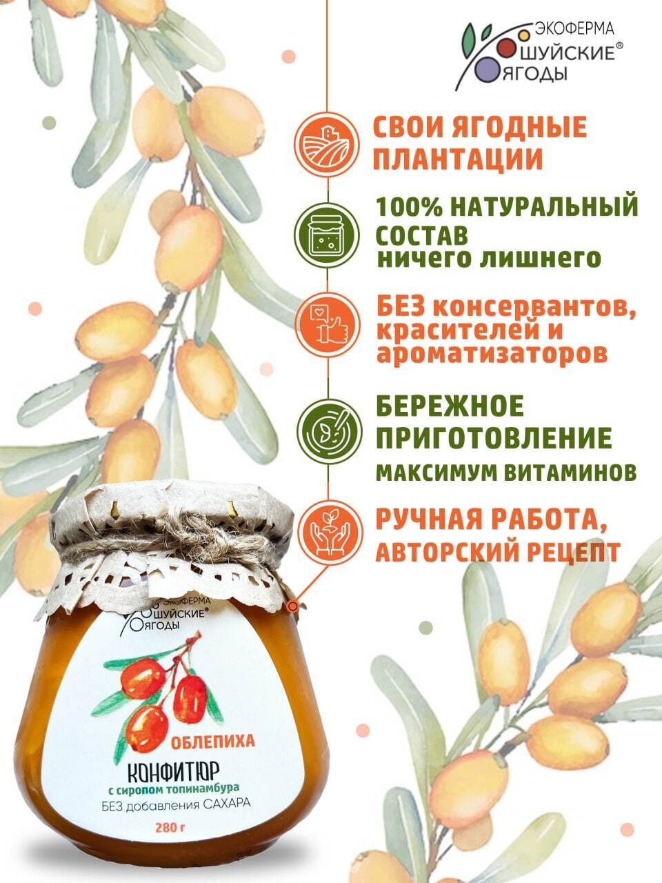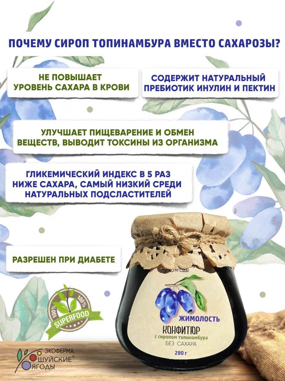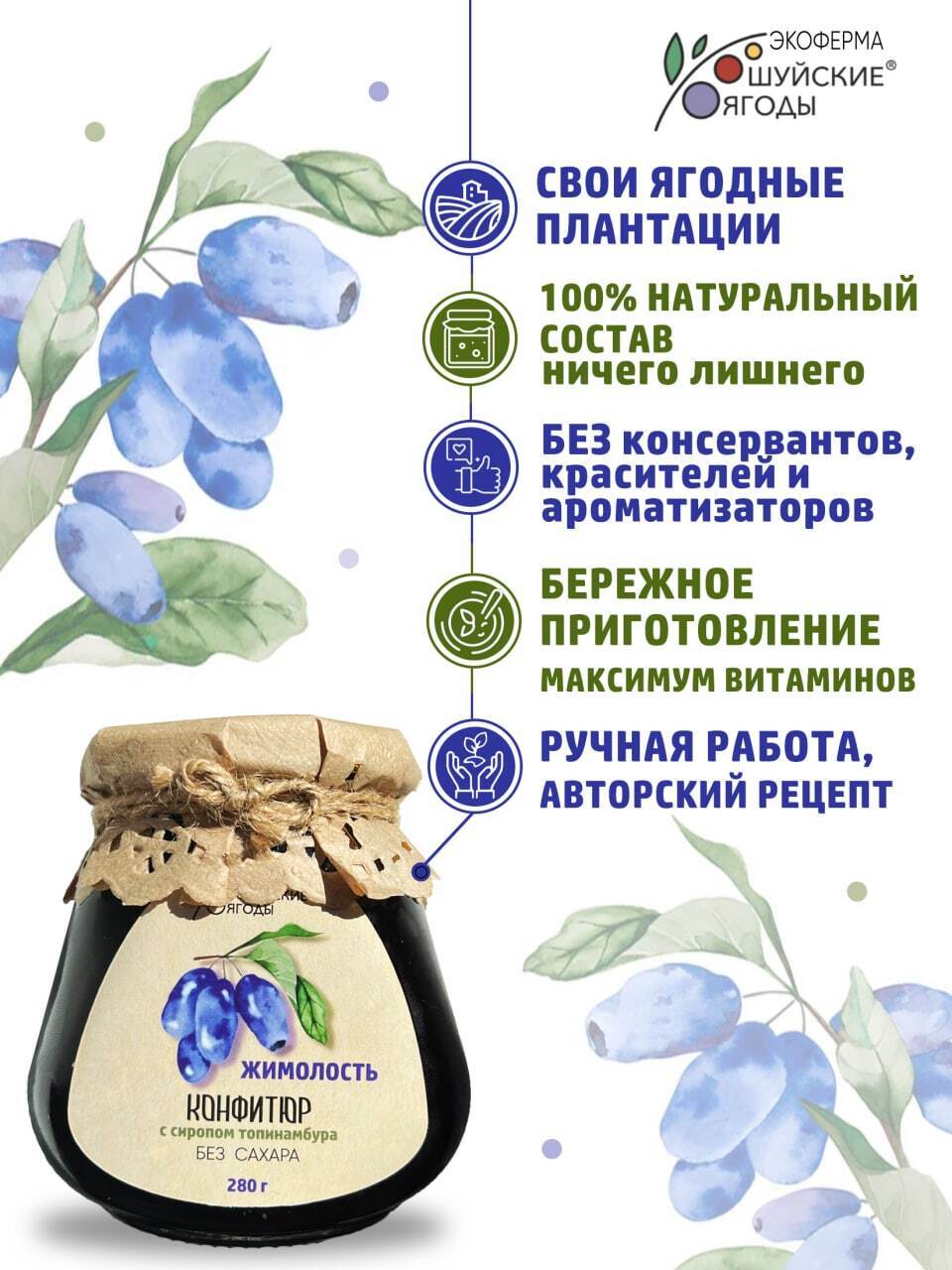Низкокалорийный диетический конфитюр из жимолости с сиропом топинамбура имеет 100% натуральный состав. Он производится вручную, без сахара, фруктозы, консервантов и любых синтетических добавок, из ягод жимолости, которые мы сами вырастили на семейной экоферме в Ивановской области. Благодаря пектину в составе, конфитюр густеет и приобретает более плотную консистенцию при охлаждении. В качестве подсластителя используется натуральный и полезный заменитель сахара - сироп топинамбура, который содержит пребиотик Инулин, витамины, микроэлементы и полезные аминокислоты. Его гликемический индекс самый низкий среди натуральных сиропов. Он не повышает уровень сахара в крови и не замедляет обмен веществ, разрешен при диабете, укрепляет организм и выводит токсины, улучшает пищеварение и нормализует уровень холестерина. Жимолость содержит витамины А, В1, В2, С, минералы, калий, магний, йод, способствует нормализации артериального давления и омоложению организма. Этот полезный и очень вкусный десерт не навредит фигуре, идеально подходите тем, кто заботится о своем здоровье, ограничивает количество углеводов, придерживается правильного питания (ПП), для похудения или снижения веса. Он укрепит иммунитет в сезон простуд, поднимет настроение и станет оригинальным гастрономическим подарком.Попробуйте и другие вкусы наших натуральных конфитюров без сахара, из клубники, малины и облепихи. Вы влюбитесь в них с первой ложечки! Перед употреблением рекомендуем охладить, после вскрытия хранить при температуре от +2 до +6 С не более 48 часов.