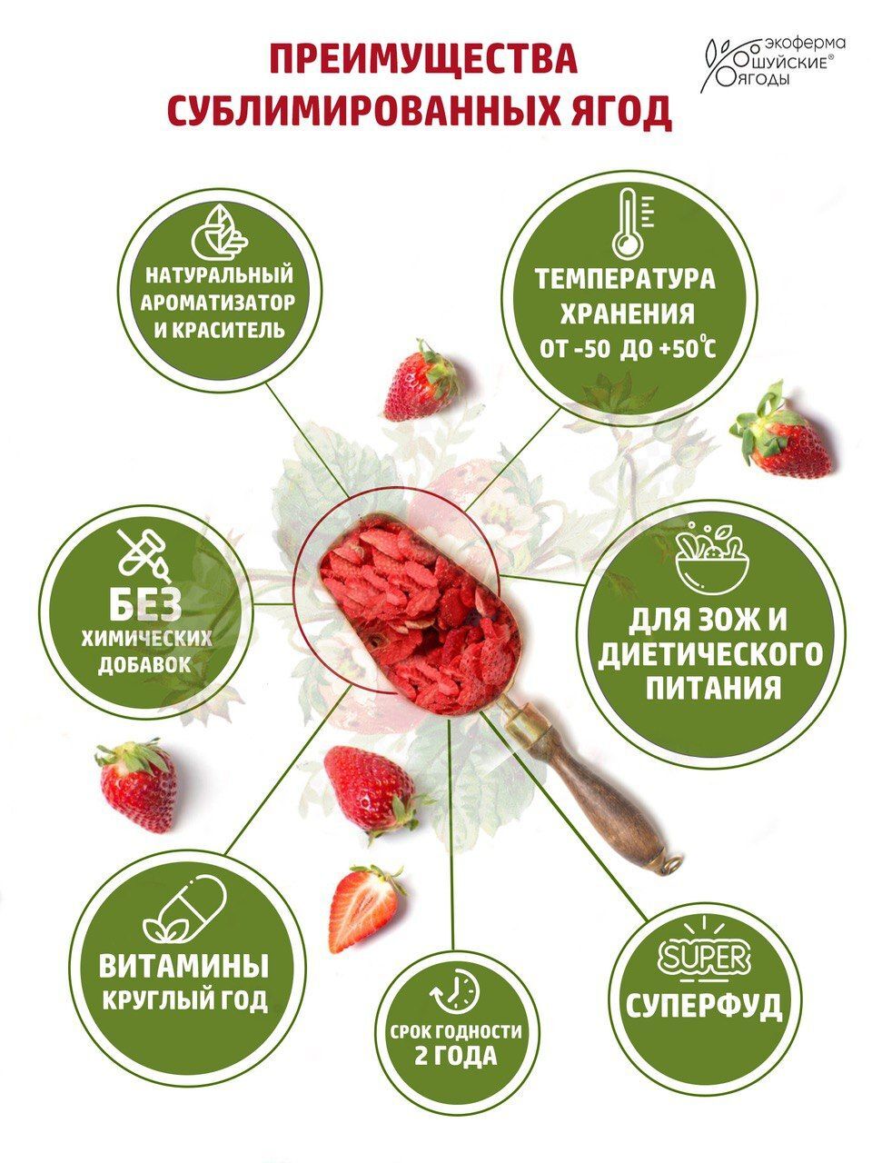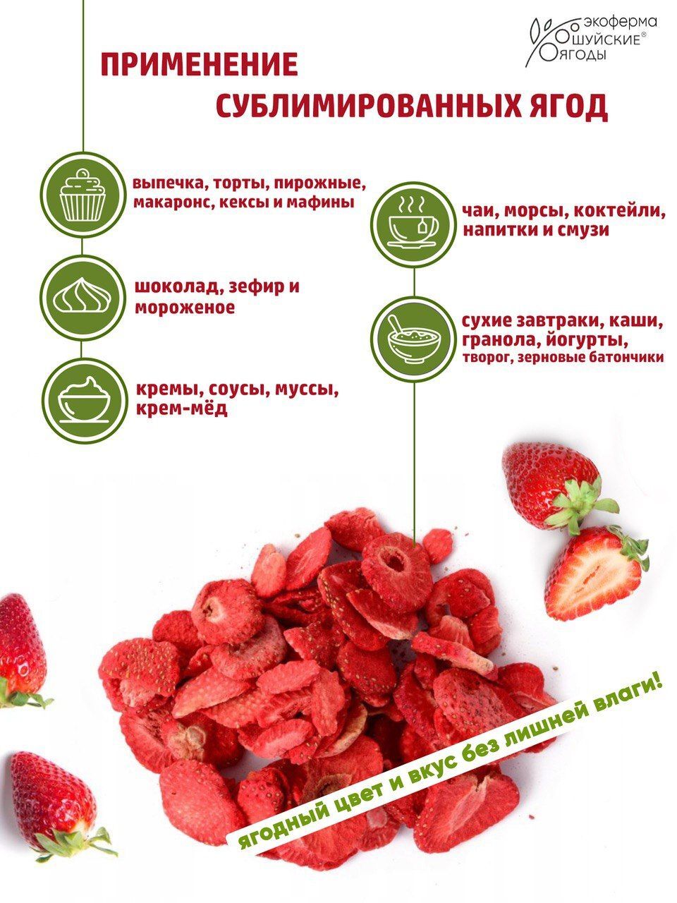 Сублимированные ягоды клубники станут прекрасным дополнением к вашему рациону. Их можно добавлять в каши, чай, выпечку, кисломолочные продукты или использовать в качестве легкого и полезного перекуса. Для их производства не используются консерванты, красители, ароматизаторы и другие добавки. Только ягоды клубники, выращенные и собранные на наших плантациях.